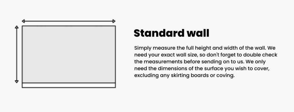 Take your measuring tape and note down the widest width and the highest height of your wall. We only need wall measurements, don’t include any skirting board or coving.