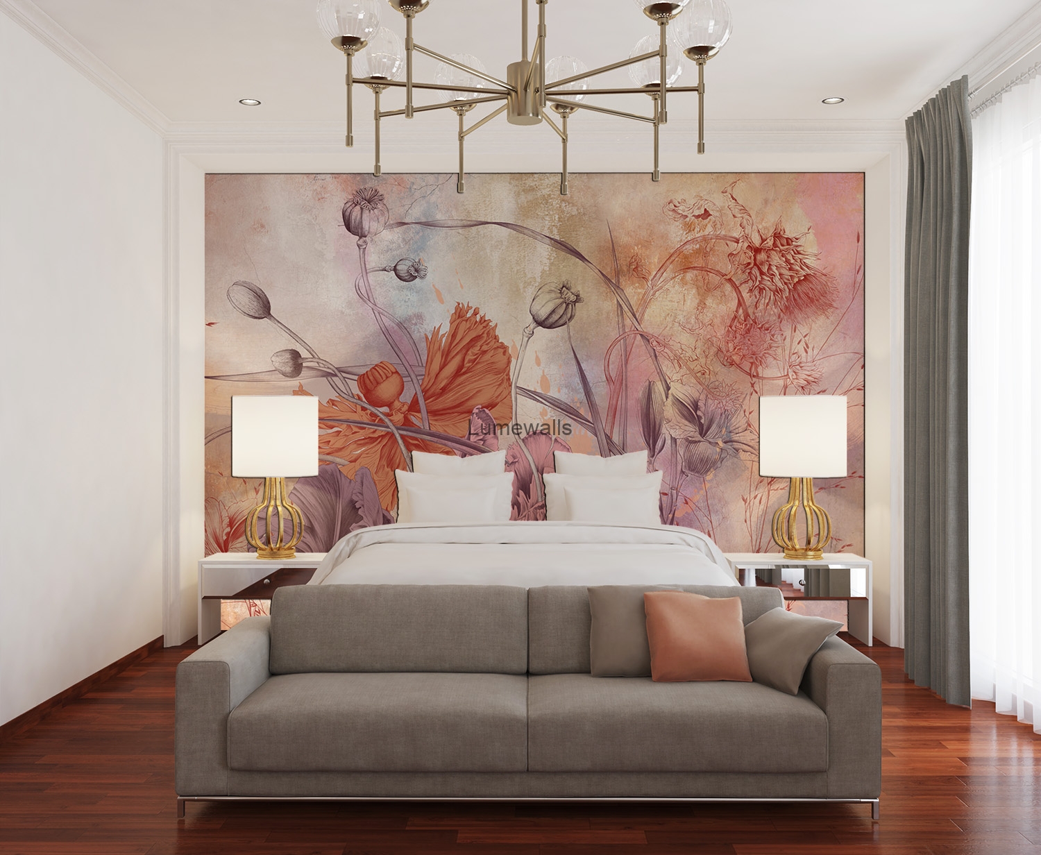 Multiple blossoms harmonize across the wall, accompanied by layered foliage, curling stems, and softly unfolding petals arranged in balanced clusters. The composition builds depth through overlapping forms and tonal gradation within each bloom. Expressive brush sweeps are visible at the petal edges, adding painterly authenticity. Gentle highlights and shaded recesses create movement, as though each flower responds to light differently. The background remains understated, allowing the ensemble to resonate without distraction. Installed in a formal sitting room, it complements tailored upholstery and metallic accents with poised elegance. The layering technique achieves richness while maintaining clarity between elements. Altogether, the mural feels orchestrated, graceful, and luxuriously composed.